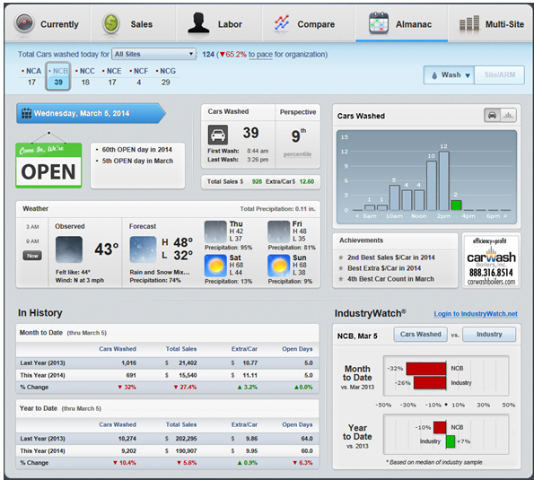 Site info: This displays the name and location code of the carwash along with the last updated time that the Data Collector got information from SiteWatch.